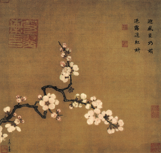 《倚雲仙杏圖》可以看出馬遠花鳥畫的基本面貌,用筆工整,設色濃重。此圖只畫出從畫幅左下角伸出的花枝的一部分,這種局部描寫的構圖手法,與他的山水畫中的「一角」、「半邊」處理有相通相似之處。花枝曲折橫斜,然後一分枝指向左上,一分枝指向右下。枝條以細筆濃墨鉤勒,再施以水墨渲染;枝上層層疊疊盛開的花朵、含苞欲放的花蕾則施以厚重的白粉加淡紅,萼片施以紫色。整個花枝既有曲折多變而挺秀的姿態之美,又透露出幾分華貴之氣。