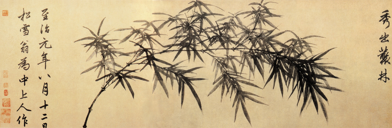 此圖卷可分三段,分別為趙孟頫、趙孟頫之妻管道昇、趙孟頫次子趙雍所畫竹三支。第一段趙孟頫所畫之竹,自畫卷後方斜出,以淡墨畫出,濃墨加點,筆法溫雅厚重,墨色變化細膩豐富。第二段為管道昇所寫竹。此竹亦從畫面左下斜出,向右伸展,筆法文秀,墨色溫潤,頗見女性嫻淑氣質。第三段為趙孟頫之次子趙雍所畫。其竹從畫面右下斜出,筆法勁健,以重墨寫出,枝幹多見干筆,更有一種生機勃勃之勢。