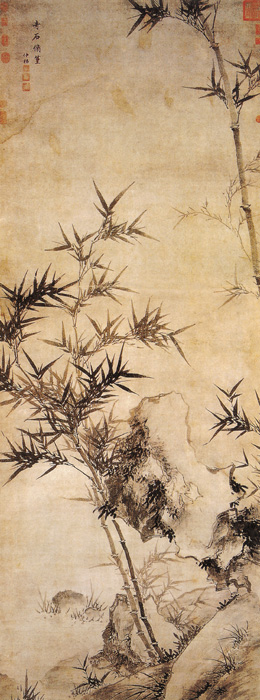 夏㫤的畫竹往往能進入一種:風梢舞空煙,露葉滴晴月,風竹瀟灑婆娑、楚楚動人的境界。真所謂「嬋娟不失筠粉態,蕭颯盡得風煙情;舉頭忽看不似畫,低耳靜聽疑有聲」。在《奇石修篁圖》中畫家通過筆墨的錘煉配合了客觀的模擬,營造了一種優美逼真的藝術殿堂。