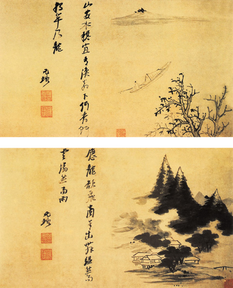 倪元璐(1593—1644),明代書法家。字玉汝,號鴻寶,浙江上虞人。天啟二年(1622)進士,改庶吉士,授編修,累遷國子祭酒,工書畫,他善畫竹石雲山,喜歡用水墨生暈之法,蒼潤古雅,繞有風致。這幅圖冊共八開,每開都有自書的對題,這裡選的是其中的兩開,線條簡略,筆墨具備。