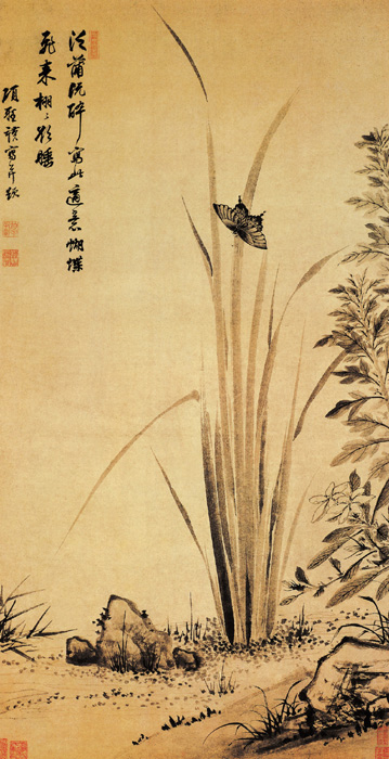 此畫描繪了一種十分清淨雅致的環境。池水清澈,葦葉勁挺,岩石突兀,水藻浮生,或疏或密,極富生機。畫中心有菖蒲一叢,勁健挺拔,長葉如劍,一雙蝴蝶環繞於上,隨風搖曳,動感生機無限。岸邊鮮花怒放,枝葉繁茂,更是生意昂然。畫上有項聖謨的自題。畫家以淡墨寫出菖蒲,筆勢遒勁飄逸,隱約可見筆道中的飛白;蝴蝶用濃細的墨線勾畫,一絲不苟。菖蒲的寫意簡括與蝴蝶的工整細緻形成強烈的對比,頓使簡單古拙的菖蒲變得無比生動自然。