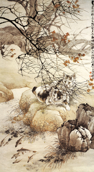程璋字德璋,號瑤笙,安徽休寧人。他曾隨父在江蘇泰興、常州,後寓居上海,做過清華大學的講師。工畫花卉、翎毛、草蟲、走獸,兼能山水、人物、參用西洋畫法,熟諳透視,結合寫生,形象真實。色彩濃麗,構圖自然別緻,他的繪畫,能自創新貌。此圖畫池塘邊兩隻花貓,葡匐在石塊岸上,雙眼緊盯著池塘中的游魚。由於畫家懂得生物百態,所以畫石頭,池邊的水草,浮萍樹幹,樹枝及紅葉,在透視的處理上,遠近、前後、濃淡、深淺等,都能合乎自然物象的真實。