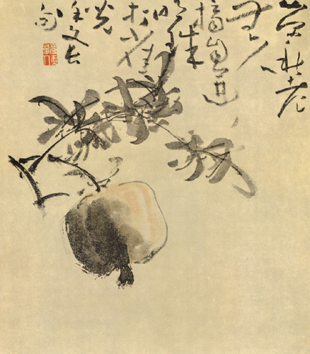 黃慎(1687—1765),字恭壽,號癭瓢子,福建寧化人,為「揚州八怪」之一,擅長人物、山水、花卉,用筆酣暢,縱橫馳騁,極盡變化。他從唐代懷素的草書中體會到其用筆的絕妙之處,便把草書的運筆用到繪畫中去,創立了自己的風格。此幅《石榴圖》就是用草書筆法寫成,別有韻味。