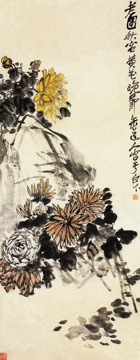 《菊石圖》是吳昌碩以慣用的斜對角章法而作,集中在畫面左邊,靠頂角畫有姚黃大菊,雙鉤花瓣,濃墨點葉,枝幹上有兩個花蕾,下面有巨石一塊,數朵魏紫,中間隔著一朵白菊,昂首怒放,風姿綽約,濃墨深葉襯托著花朵,花枝扶疏,畫之右下角點著大小不同的墨點,各種盛開的菊花,呈現出鮮艷多姿,神韻秀麗,凌風傲霜,可見畫家寄托著他清高脫俗的精神品格。